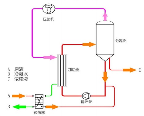 機械式蒸汽再壓縮MVR蒸發(fā)器利用蒸發(fā)器中產(chǎn)生的二次蒸汽,經(jīng)壓縮機壓縮,壓力、溫度升高,熱焓增加,然后送到蒸發(fā)器的加熱室當作加熱蒸汽使用,使料液維持沸騰狀態(tài),而加熱蒸汽本身則冷凝成水。這樣,原來要廢棄的蒸汽就得到了充分的利用,回收了潛熱,又提高了熱效率,生蒸汽的經(jīng)濟性相當于多效蒸發(fā)的30效,減少了對外部加熱及冷卻資源的需求,降低能耗,減少污染。